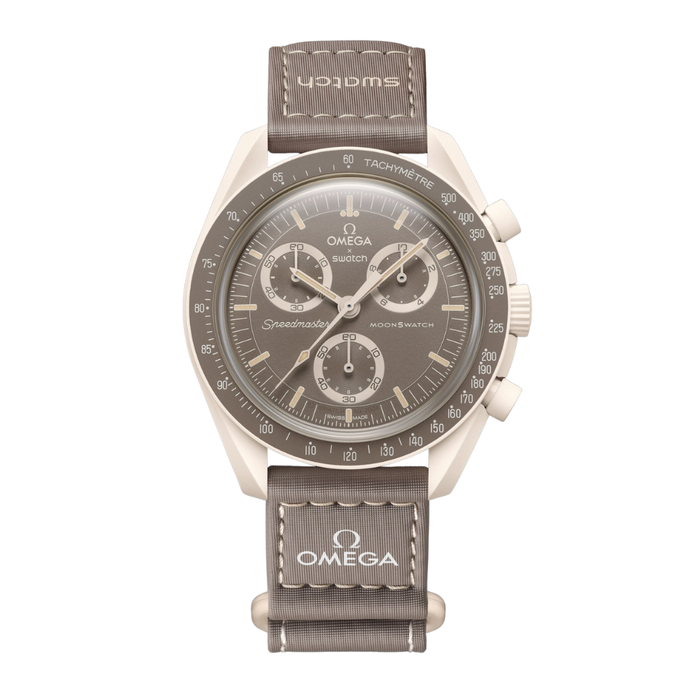 Este reloj de edición no limitada está diseñado con una caja, corona y pulsadores de Bioceramic en color arena y una correa de VELCRO® color greige con un pespunte contrastante de color arena. Incluye una esfera greige con manecillas de color arena. Las subesferas incluyen los números e índices arábigos en formato radial para rendir homenaje a los Speedmaster de los proyectos Alaska II y III. El bisel greige está adornado con una escala taquimétrica de color arena. Todas las esferas de la colección incluyen la marca OMEGA X Swatch, el emblemático logotipo de Speedmaster y el logotipo de MoonSwatch. El cristal de origen biológico convexo doble, la "S” grabada integrada en el centro del cristal, el fino y sofisticado patrón circular del anillo exterior de la esfera y de las subesferas rebajadas, la estructura angular y lisa de las asas, el emblemático detalle “dot over 90” en la escala taquimétrica y, por supuesto, el exclusivo tacto de Bioceramic son comunes en todos los modelos. Las manecillas de las horas y los minutos, los marcadores de la hora y la punta del segundero del cronógrafo crean un efecto Super-LumiNova® (de emisión verde) que proporciona un brillo perfecto en la oscuridad.