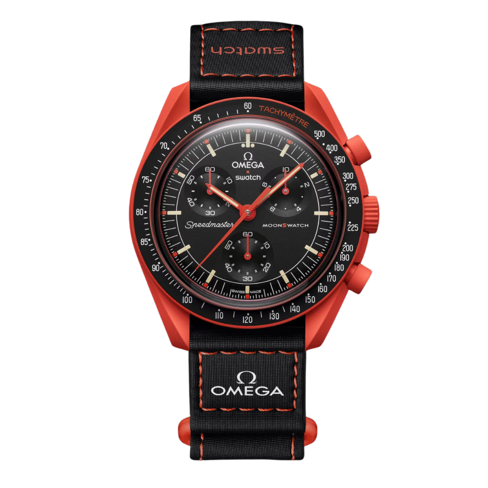 Este reloj de edición no limitada incluye una caja, corona y pulsadores de Bioceramic de color naranja vibrante, y una correa de VELCRO® negra con un pespunte de color naranja contrastante. Su diseño incluye una esfera negra con las manecillas y los marcadores de la hora en color naranja. El segundero del cronógrafo es de color naranja para rendir homenaje a la forma y color del modelo Speedmaster Moonwatch “Ultraman” 1968 de OMEGA. Las subesferas incluyen los números e índices arábigos en formato radial para rendir homenaje a los Speedmaster de los proyectos Alaska II y III. El bisel negro está adornado con una escala taquimétrica blanca y la palabra “TACHYMÈTRE” escrita en color naranja. Todas las esferas de la colección incluyen la marca OMEGA X Swatch, el emblemático logotipo de Speedmaster y el logotipo de MoonSwatch. La estructura del cristal de origen biológico convexo doble, la "S” grabada integrada en el centro del cristal, el fino y sofisticado patrón circular del anillo exterior de la esfera y de las subesferas rebajadas, la estructura angular y lisa de las asas, el emblemático detalle “dot over 90” en la escala taquimétrica y, por supuesto, el exclusivo tacto de Bioceramic son comunes en todos los modelos. Las manecillas de las horas y los minutos, y los marcadores de la hora contienen Super-LumiNova® (de emisión verde), un material que proporciona un brillo perfecto en la oscuridad.