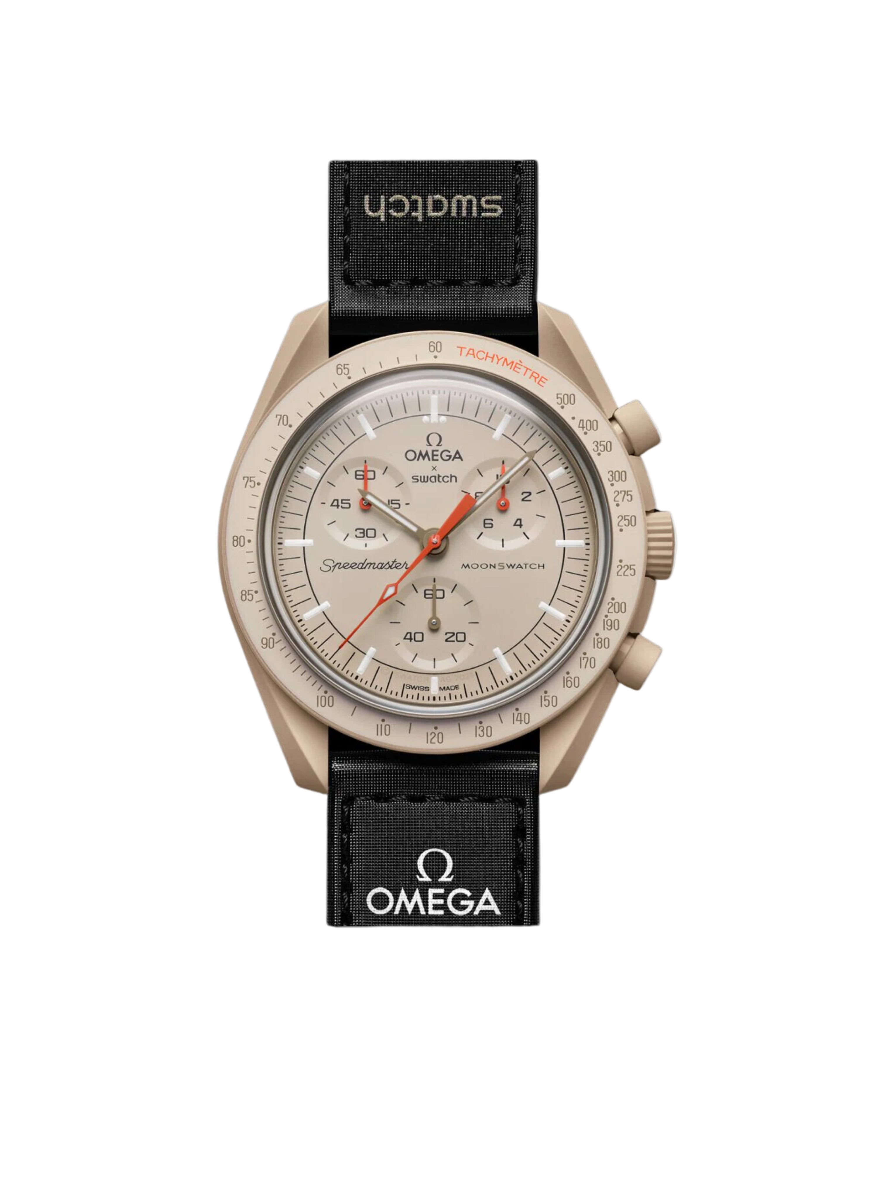 Los tonos beige de este reloj de edición no limitada contrastan perfectamente con la correa de VELCRO® negra. El segundero del cronógrafo y las manecillas de las subesferas a las 10 y a las 2 en punto son de color naranja para rendir homenaje al Speedmaster Ultraman. La manecilla de la subesfera ubicada a las 6 es de color café. Una escala taquimétrica de color beige oscuro con detalles en naranja adorna el bisel de color beige claro. Todas las esferas de la colección incluyen la marca OMEGA X Swatch, el emblemático logotipo Speedmaster y el logotipo de MoonSwatch. La estructura del cristal de origen biológico, la "S” grabada integrada en el centro del cristal, el fino y sofisticado patrón circular del anillo exterior de la esfera y de las subesferas incrustadas, la estructura angular y lisa de las asas, el emblemático detalle “dot over 90” en la escala taquimétrica y, por supuesto, el exclusivo tacto de Bioceramic son comunes en todos los modelos. La manecilla de las horas y los minutos, el segundero del cronógrafo y los marcadores de la hora crean un efecto Super-LumiNova® un material que hace que brillen en la oscuridad.