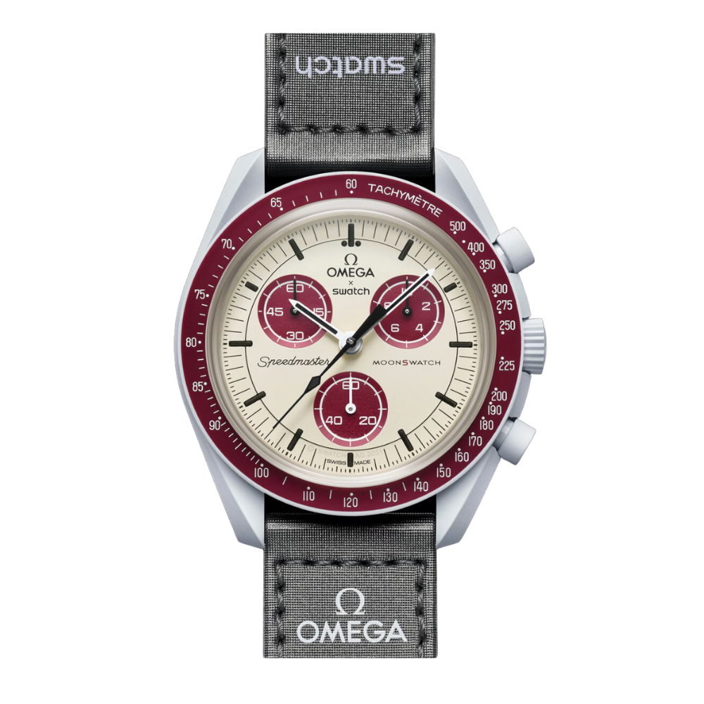 En este elegante reloj de edición no limitada, los tonos grises, claros y fríos, contrastan con la correa de VELCRO® gris oscuro. El cronógrafo incluye una esfera en color cáscara de huevo con las manecillas de horas y minutos bicolores en blanco y negro, el segundero del cronógrafo en color negro y las subesferas y en bisel en tono burdeos. Las manecillas de las subesferas ubicadas a las 10 y las 2 en punto son negras, mientras que la manecilla de la subesfera ubicada a las 6 y la escala taquimétrica son blancas. Todas las esferas de la colección incluyen la marca OMEGA X Swatch, el emblemático logotipo Speedmaster y el logotipo de MoonSwatch. La estructura del cristal de origen biológico, la "S” grabada integrada en el centro del cristal, el fino y sofisticado patrón circular del anillo exterior de la esfera y de las subesferas incrustadas, la estructura angular y lisa de las asas, el emblemático detalle “dot over 90” en la escala taquimétrica y, por supuesto, el exclusivo tacto de Bioceramic son comunes en todos los modelos.